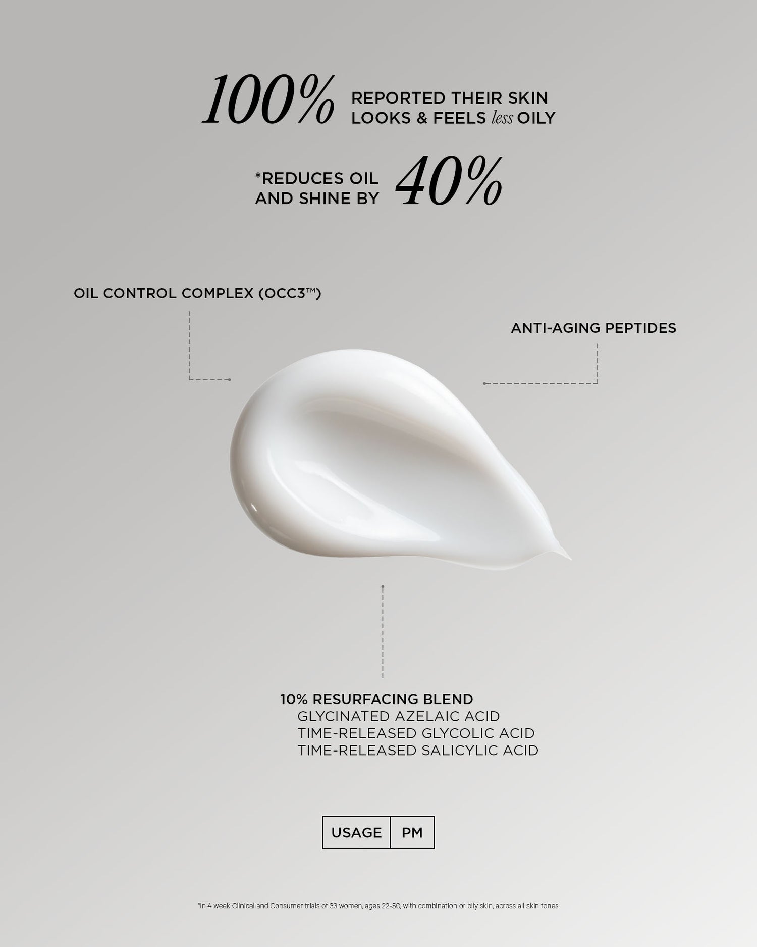 Our exclusive Oil Control Complex (OCC3)® is the secret weapon that targets the root cause of excess oil, while a potent, but gentle 10% exfoliating blend and anti-aging peptides deliver noticeably clearer, balanced, more radiant skin.