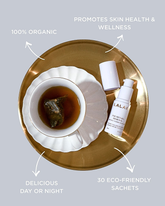 THE BEAUTY BLEND is a premium organic herbal tea designed to support skin health and overall wellness from the inside out. This thoughtfully formulated blend of organic ingredients delivers antioxidant, anti inflammatory, and digestive benefits to help reduce oxidative stress and promote a clearer, more balanced complexion.