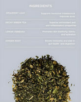 A refreshing herbal ingredient rich in antioxidants and vitamins A, C and B complex. Known for its cooling and calming properties, spearmint supports digestion, helps reduce bloating, promotes hormonal balance, and supports clear, balanced skin.