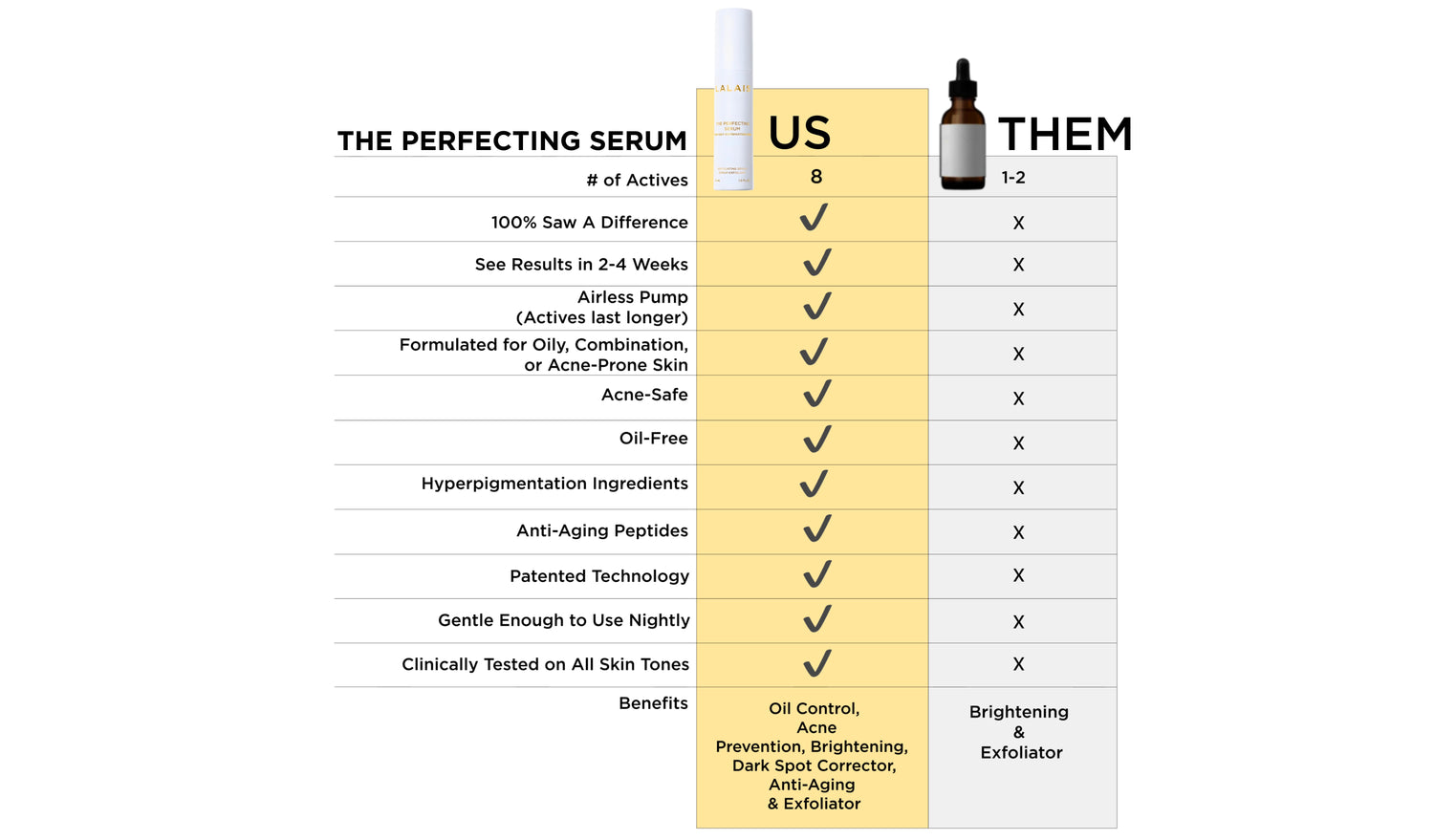 We are mindful that inflammation can trigger oil production and hyperpigmentation. Our formulas deliver maximum efficacy while minimizing irritation. THE PERFECTING SERUM is not accompanied by intense stinging or burning, but it is hard at work transforming your skin for the long term.
