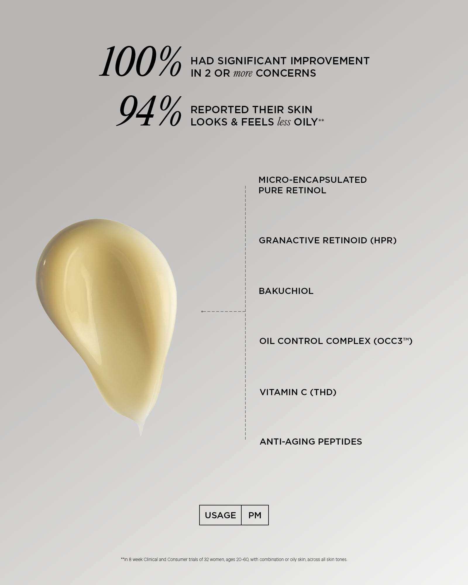 Oil Control Complex (OCC3), pure naturally encapsulated retinol, Granactive Retinoid (HPR), vitamin C ester (THD), anti aging peptides.