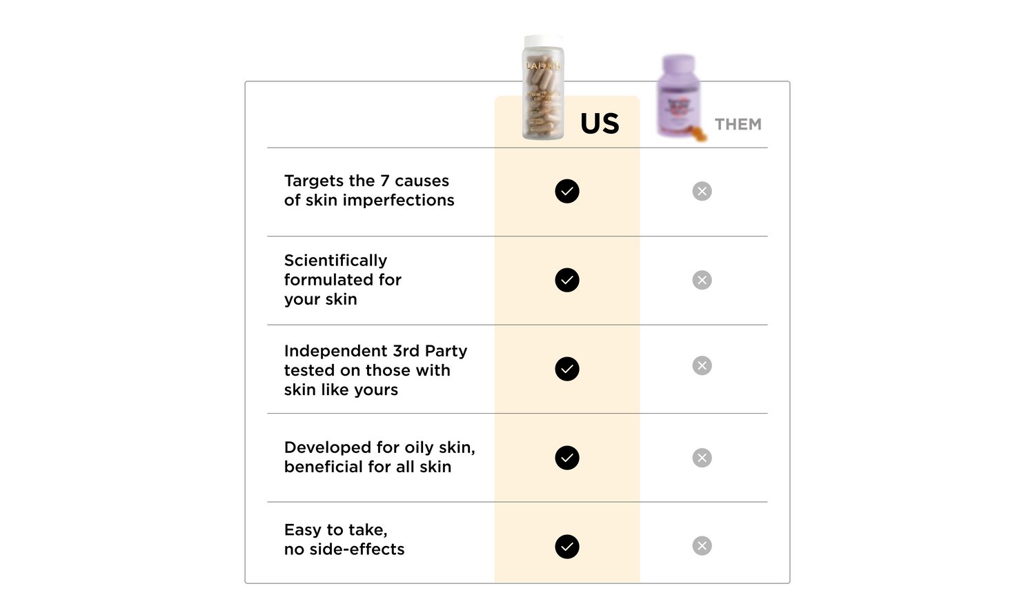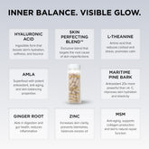 Clearer, smoother, brighter skin actually begins from within. Our unique formula targets the seven causes of skin imbalance, including excess oil, breakouts, dehydration, gut health, stress, hormones, and inflammation for unmistakable clarity, balance, and radiance.