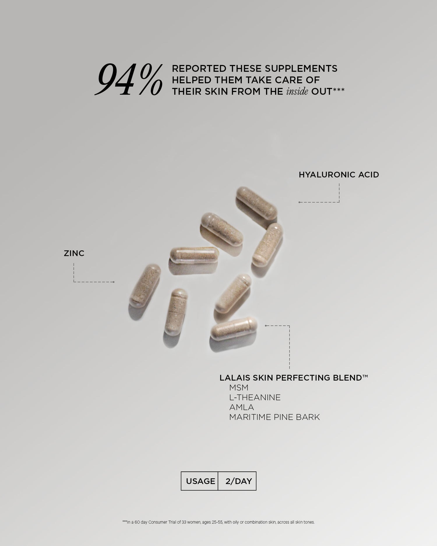 94% of participants in the independent Consumer Use Study reported experiencing positive changes in their skin in the 60 day testing period.
